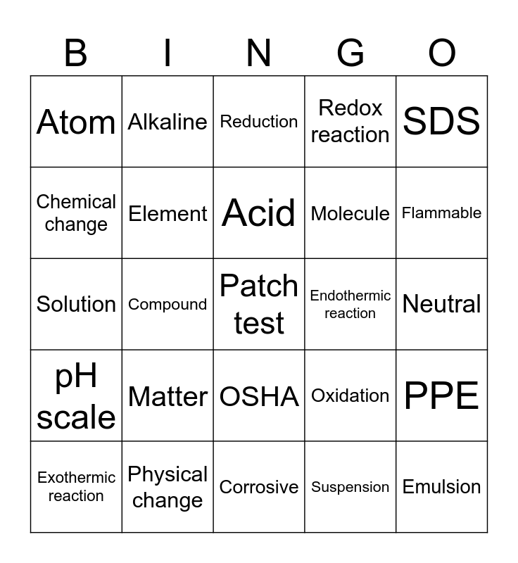 This bingo card has a free space and 24 words: Matter, Physical change, Acid, Exothermic reaction, SDS, Atom, Chemical change, Alkaline, Endothermic reaction, OSHA, Molecule, Solution, Oxidation, PPE, Element, Suspension, Neutral, Reduction, Flammable, Compound, Emulsion, pH scale, Redox reaction and Corrosive.