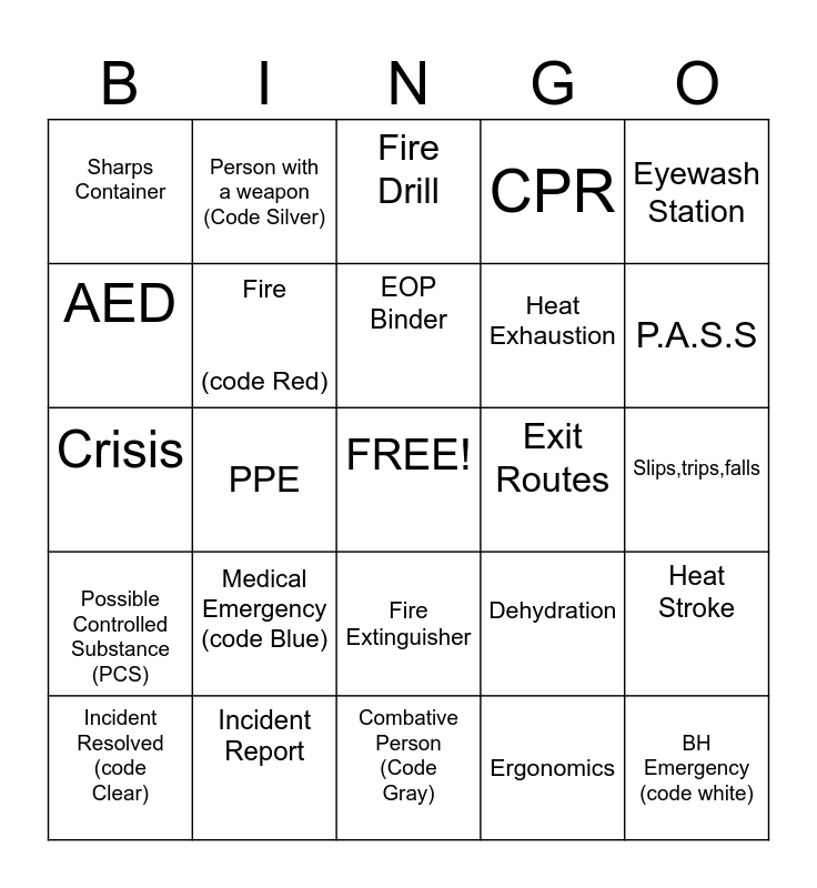 This bingo card has a free space and 24 words: Medical Emergency (code Blue), Incident Report, EOP Binder, Incident Resolved (code Clear), Eyewash Station, Sharps Container, AED, Person with a weapon (Code Silver), Exit Routes, Fire Extinguisher, Heat Exhaustion, Crisis, Dehydration, Heat Stroke, Fire (code Red), Ergonomics, Slips,trips,falls, Fire Drill, P.A.S.S, PPE, BH Emergency (code white), Possible Controlled Substance (PCS), CPR and Combative Person (Code Gray).