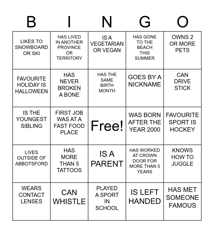 This bingo card has a free space and 24 words: HAS MORE THAN 5 TATTOOS, CAN WHISTLE, HAS THE SAME BIRTH MONTH, WEARS CONTACT LENSES, OWNS 2 OR MORE PETS, LIKES TO SNOWBOARD OR SKI, FAVOURITE HOLIDAY IS HALLOWEEN, HAS LIVED IN ANOTHER PROVINCE OR TERRITORY, WAS BORN AFTER THE YEAR 2000, IS A PARENT, GOES BY A NICKNAME, IS THE YOUNGEST SIBLING, HAS WORKED AT CROWN DOOR FOR MORE THAN 5 YEARS, KNOWS HOW TO JUGGLE, HAS NEVER BROKEN A BONE, IS LEFT HANDED, FAVOURITE SPORT IS HOCKEY, IS A VEGETARIAN OR VEGAN, CAN DRIVE STICK, FIRST JOB WAS AT A FAST FOOD PLACE, HAS MET SOMEONE FAMOUS, LIVES OUTSIDE OF ABBOTSFORD, HAS GONE TO THE BEACH THIS SUMMER and PLAYED A SPORT IN SCHOOL.