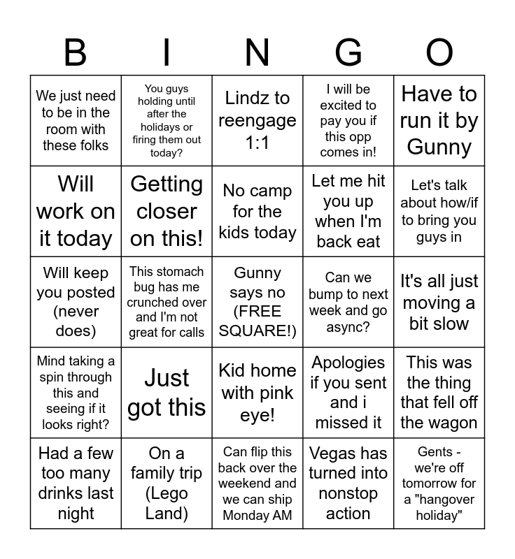 This bingo card has a free space and 24 words: Just got this, On a family trip (Lego Land), No camp for the kids today, Had a few too many drinks last night, Have to run it by Gunny, We just need to be in the room with these folks, Will work on it today, You guys holding until after the holidays or firing them out today?, Can we bump to next week and go async?, Kid home with pink eye!, Let me hit you up when I'm back eat, Will keep you posted (never does), Apologies if you sent and i missed it, This was the thing that fell off the wagon, Getting closer on this!, Vegas has turned into nonstop action, It's all just moving a bit slow, Lindz to reengage 1:1, Let's talk about how/if to bring you guys in, This stomach bug has me crunched over and I'm not great for calls, Gents - we're off tomorrow for a "hangover holiday", Mind taking a spin through this and seeing if it looks right?, I will be excited to pay you if this opp comes in! and Can flip this back over the weekend and we can ship Monday AM.