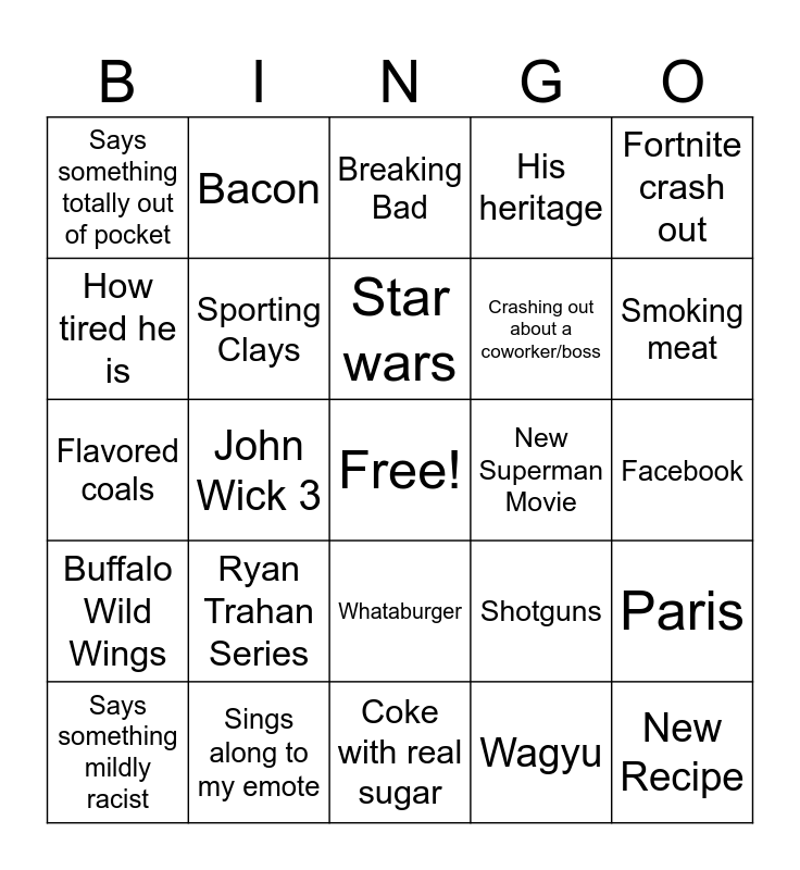 This bingo card has a free space and 24 words: Ryan Trahan Series, Sings along to my emote, Star wars, Says something mildly racist, Fortnite crash out, Says something totally out of pocket, How tired he is, Bacon, New Superman Movie, Whataburger, Crashing out about a coworker/boss, Flavored coals, Shotguns, Paris, Sporting Clays, Wagyu, Facebook, Breaking Bad, Smoking meat, John Wick 3, New Recipe, Buffalo Wild Wings, His heritage and Coke with real sugar.