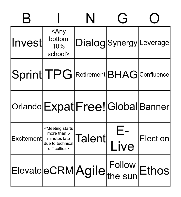 This bingo card has a free space and 35 words: World class, Vashon, True North, TPG, Talent, Synergy, Sprint, San Francisco, Retirement, Record-setting, Orlando, Leverage, Jeff, iVenture, Invest, Global, Follow the sun, Expat, Excitement, Ethos, E-Live, Elevate, Election, eCRM, Dialog, Confluence, Cloud, Brainstorm, BHAG, Banner, Amazon, Agile, <Meeting starts more than 5 minutes late due to technical difficulties>, <Any bottom 10% school> and <A sports analogy>.