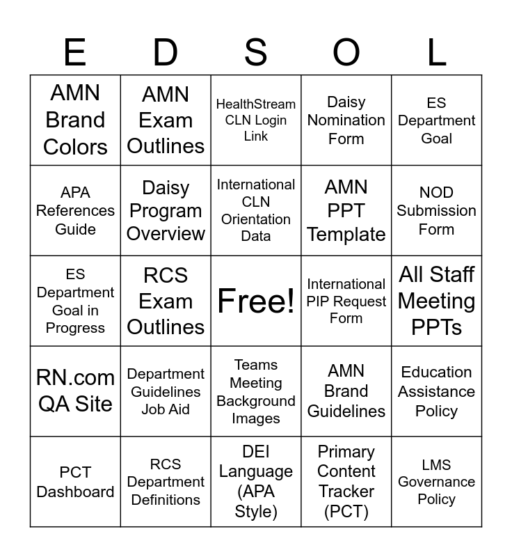 This bingo card has a free space and 24 words: Department Guidelines Job Aid, RCS Department Definitions, International CLN Orientation Data, PCT Dashboard, ES Department Goal, AMN Brand Colors, APA References Guide, AMN Exam Outlines, International PIP Request Form, Teams Meeting Background Images, AMN PPT Template, ES Department Goal in Progress, AMN Brand Guidelines, Education Assistance Policy, Daisy Program Overview, Primary Content Tracker (PCT), All Staff Meeting PPTs, HealthStream CLN Login Link, NOD Submission Form, RCS Exam Outlines, LMS Governance Policy, RN.com QA Site, Daisy Nomination Form and DEI Language (APA Style).