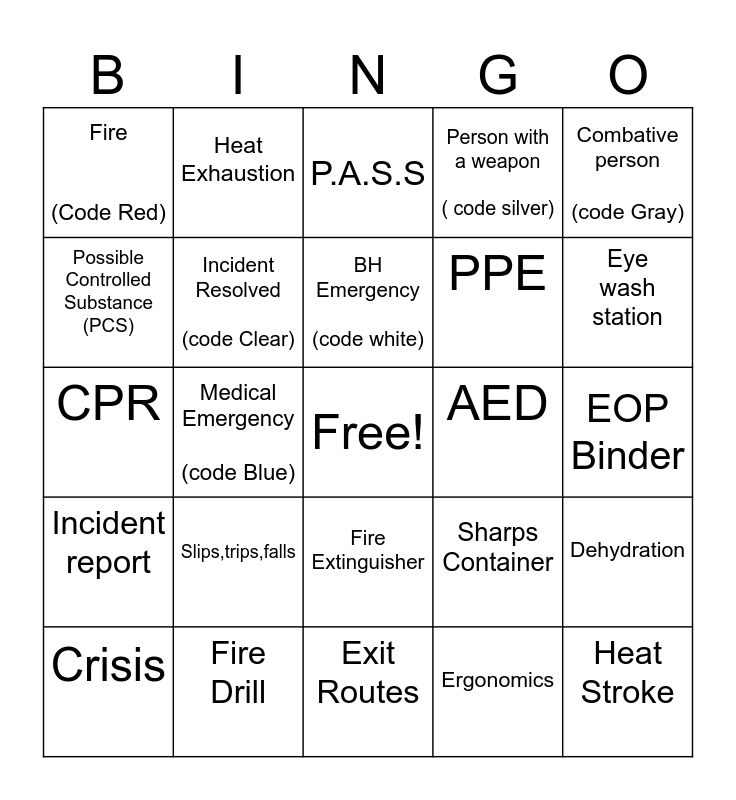 This bingo card has a free space and 24 words: Slips,trips,falls, Fire Drill, BH Emergency (code white), Crisis, Combative person (code Gray), Fire (Code Red), Possible Controlled Substance (PCS), Heat Exhaustion, AED, Fire Extinguisher, PPE, CPR, Sharps Container, Dehydration, Incident Resolved (code Clear), Ergonomics, EOP Binder, P.A.S.S, Eye wash station, Medical Emergency (code Blue), Heat Stroke, Incident report, Person with a weapon ( code silver) and Exit Routes.