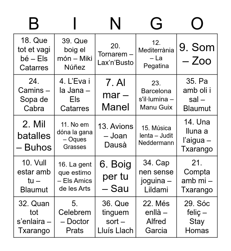 This bingo card has 40 words: 1. El teu amor – Miki Núñez, 2. Mil batalles – Buhos, 3. La platja – Stay Homas, 4. L’Eva i la Jana – Els Catarres, 5. Celebrem – Doctor Prats, 6. Boig per tu – Sau, 7. Al mar – Manel, 8. Tot és més fàcil – Txarango, 9. Som – Zoo, 10. Vull estar amb tu – Blaumut, 11. No em dóna la gana – Oques Grasses, 12. Mediterrània – La Pegatina, 13. Avions – Joan Dausà, 14. Una lluna a l’aigua – Txarango, 15. Música lenta – Judit Neddermann, 16. La gent que estimo – Els Amics de les Arts, 17. Lluna plena – Buhos, 18. Que tot et vagi bé – Els Catarres, 19. Sempre véns així – Oques Grasses, 20. Tornarem – Lax’n’Busto, 21. Compta amb mi – Txarango, 22. Més enllà – Alfred Garcia, 23. Barcelona s'il·lumina – Manu Guix, 24. Camins – Sopa de Cabra, 25. Bon dia – Els Pets, 26. Mira com va – Doctor Prats, 27. Ara som gegants – Joan Dausà, 28. Quan em parles – Blaumut, 29. Sóc feliç – Stay Homas, 30. Tornar a començar – Lax’n’Busto, 31. Sexe en català – Oques Grasses, 32. Quan tot s’enlaira – Txarango, 33. Jo mai mai – Els Amics de les Arts, 34. Cap nen sense joguina – Lildami, 35. Pa amb oli i sal – Blaumut, 36. Que tinguem sort – Lluís Llach, 37. La cançó del sol – Doctor Prats, 38. Festa major – Buhos, 39. Que boig el món – Miki Núñez and 40. Respira – Oques Grasses.