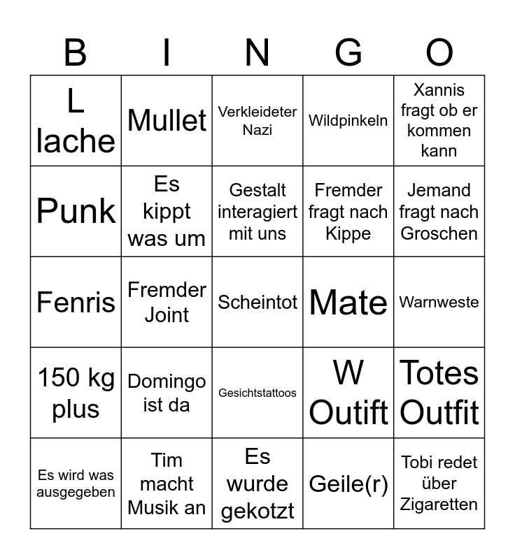 This bingo card has a free space and 24 words: Domingo ist da, Tim macht Musik an, Gestalt interagiert mit uns, Es wird was ausgegeben, Xannis fragt ob er kommen kann, L lache, Punk, Mullet, Mate, Gesichtstattoos, Fremder fragt nach Kippe, Fenris, W Outift, Totes Outfit, Es kippt was um, Geile(r), Warnweste, Verkleideter Nazi, Jemand fragt nach Groschen, Fremder Joint, Tobi redet über Zigaretten, 150 kg plus, Wildpinkeln and Es wurde gekotzt.