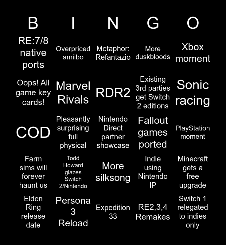 This bingo card has a free space and 24 words: Todd Howard glazes Switch 2/Nintendo, Persona 3 Reload, RDR2, Elden Ring release date, Xbox moment, RE:7/8 native ports, Oops! All game key cards!, Overpriced amiibo, Fallout games ported, More silksong, Existing 3rd parties get Switch 2 editions, COD, Indie using Nintendo IP, Minecraft gets a free upgrade, Marvel Rivals, RE2,3,4 Remakes, PlayStation moment, Metaphor: Refantazio, Sonic racing, Pleasantly surprising full physical, Switch 1 relegated to indies only, Farm sims will forever haunt us, More duskbloods and Expedition 33.