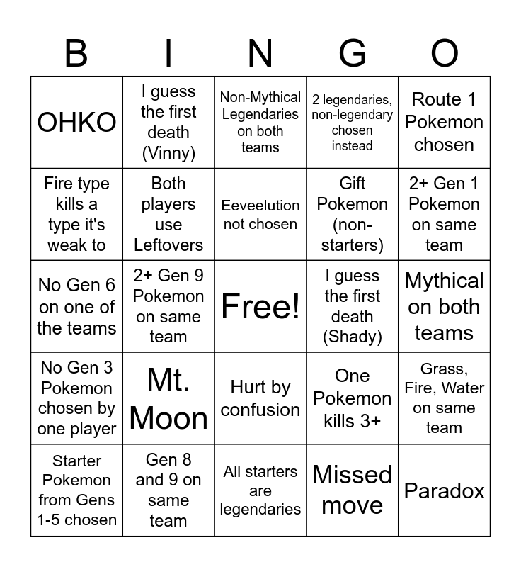This bingo card has a free space and 24 words: Mt. Moon, Gen 8 and 9 on same team, Eeveelution not chosen, Starter Pokemon from Gens 1-5 chosen, Route 1 Pokemon chosen, OHKO, Fire type kills a type it's weak to, I guess the first death (Vinny), I guess the first death (Shady), Hurt by confusion, Gift Pokemon (non-starters), No Gen 6 on one of the teams, One Pokemon kills 3+, Grass, Fire, Water on same team, Both players use Leftovers, Missed move, Mythical on both teams, Non-Mythical Legendaries on both teams, 2+ Gen 1 Pokemon on same team, 2+ Gen 9 Pokemon on same team, Paradox, No Gen 3 Pokemon chosen by one player, 2 legendaries, non-legendary chosen instead and All starters are legendaries.