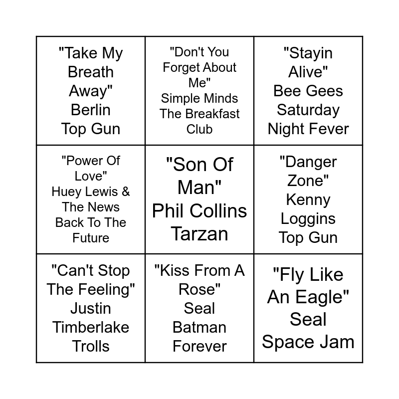 This bingo card has 20 words: "Shallow" Lady Gaga A Star Is Born, "Talking In Your Sleep" The Romantics Five Nights At Freddy's, "Stayin Alive" Bee Gees Saturday Night Fever, "I Don't Want To Miss A Thing" Aerosmith Armageddon, "Iris" Goo Goo Dolls City of Angels, "Son Of Man" Phil Collins Tarzan, "I Want You To Want Me" Cheap Trick 10 Things I Hate About You, "Take My Breath Away" Berlin Top Gun, "Fly Like An Eagle" Seal Space Jam, "Don't You Forget About Me" Simple Minds The Breakfast Club, "The Time of My Life" Bill Meadley Dirty Dancing, "You're The One That I Want" John Travolta Grease, "Danger Zone" Kenny Loggins Top Gun, "Maniac" Michael Sembello Flashdance, "Can't Stop The Feeling" Justin Timberlake Trolls, "9 To 5" Dolly Parton 9 to 5, "Kiss From A Rose" Seal Batman Forever, "Power Of Love" Huey Lewis & The News Back To The Future, "It Must Have Been Love" Roxette Pretty Woman and "Lose Yourself" Eminem 8 Mile.