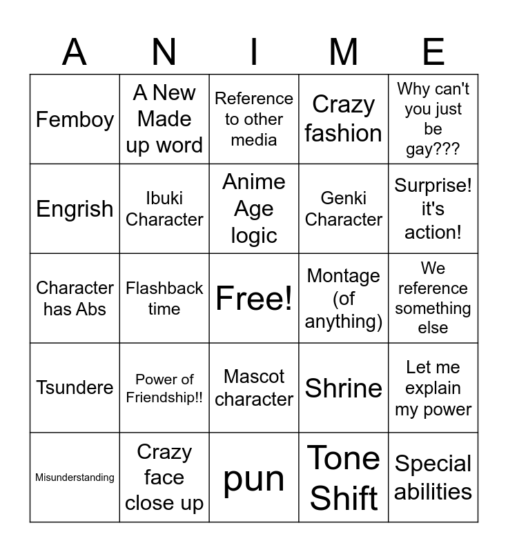This bingo card has a free space and 121 words: Inner Monologue, Exposition, Made up brand, GUN, Love Triangle, Totally not gay, Crazy fashion, Parent of the year, Let me explain my power, "My true form", Crazy villain laugh, Meme, Ridiculous name, Catchphrase, Title Drop, Sibling character, Mascot character, Cliffhanger, Humanity = Bad, Food tasting scene, Misunderstanding, Reference to other media, Sakuga, Idol, Kuudere, Tsundere, Crazy face close up, "Interesting" camera angle, Highschool, CGI, Tone Shift, Flashback time, Anime Age logic, Suddenly a Food Expert, Shouting attacks, Ojou-Sama laugh, Ara ara, Weird sibling relationship, Tig ol bitties, Random grunts, Shot is held for 10 seconds, Absent parents, Dead Mom, Dead Dad, Character alludes to a fetish, "Such speed", Voiceover, Montage (of anything), Chibi Transformation, Beach/Pool Episode, Onsen Episode, School/Vacation trip, Shrine, Culture/Sports Festival, Fireworks, Maid, Cherry Blossom, Fangs/Shark Teeth, Sweat drop, A New Made up word, Op plays during an ep, Anime Blush, Crying Moment, Foreigner Charater, Racism, Engrish, Episode without the Protag, Tension Breaking Laughter, Hand Hold, Trains, Character has Abs, Crazy Hairdo, Bright Aura, Multiple Protagonist, Student Council, Genki Character, Explosion, Recognizeable voice actor/ninjago voice, "wow"/ shock at something normal, Special abilities, Power of Friendship!!, Femboy, Organization/ explicitly named group, someone DIES on screen, homophobia, Transphobia, oh my gosh that's blood??, are they gonna kiss?, We reference something else, Hot anime boy thirst, Hot anime Girl thirst, gender ambiguous character, pun, Cat person, we guess what happens / plot point, Fourth wall break, This is just like fiction!, Good evil guy, Why can't you just be gay???, You need to see this!!, Banger opening, Akira Slide, Their just like me FRFR, Stream issues, Ibuki Character, silly animation, Stock sound effect, bad song/ sound effect for scene, Public Domain, Surprise! it's Horror!, Surprise! it's sweet!, Pause in shock, Hand Check, Surprise! it's queer!, weirdly religious tone, Surprise! it's action!, Screen shake, Gender reveal, Randomly French, Surprise! Toxic Yaoi/Yuri! and It is... (long intro about lore).