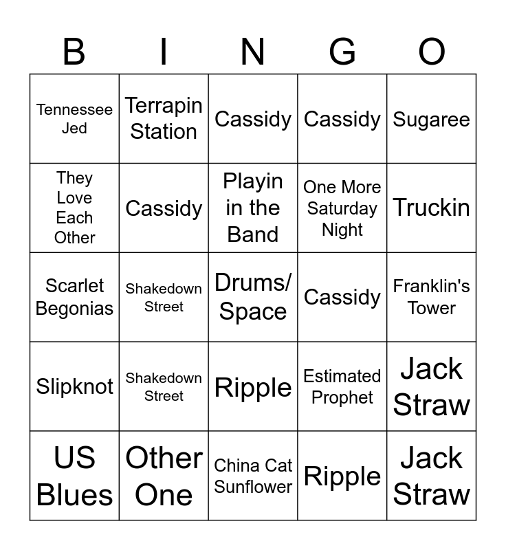 ⚠ This card has duplicate items: US Blues (5), Tennessee Jed (5), One More Saturday Night (5), Slipknot (5), Playin in the Band (4), Uncle John's Band (5), Cassidy (7), They Love Each Other (6), Truckin (6), Cold Rain and Snow (5), Help on the Way (5), Scarlet Begonias (5), Franklin's Tower (5), Casey Jones (4), Brown Eyed Women (5), China Cat Sunflower (5), Sugaree (5), Dark Star (5), Fire on the Mountain (5), Shakedown Street (5), Ripple (5), Estimated Prophet (5), Althea (5), Bertha (5), Ramble On Rose (4), St. Stephen (5), Jack Straw (5), Eyes of the World (4), Not Fade Away (5), I Know You Rider (5), Terrapin Station (5), Deal (5), Other One (4), Sugar Magnolia (3)