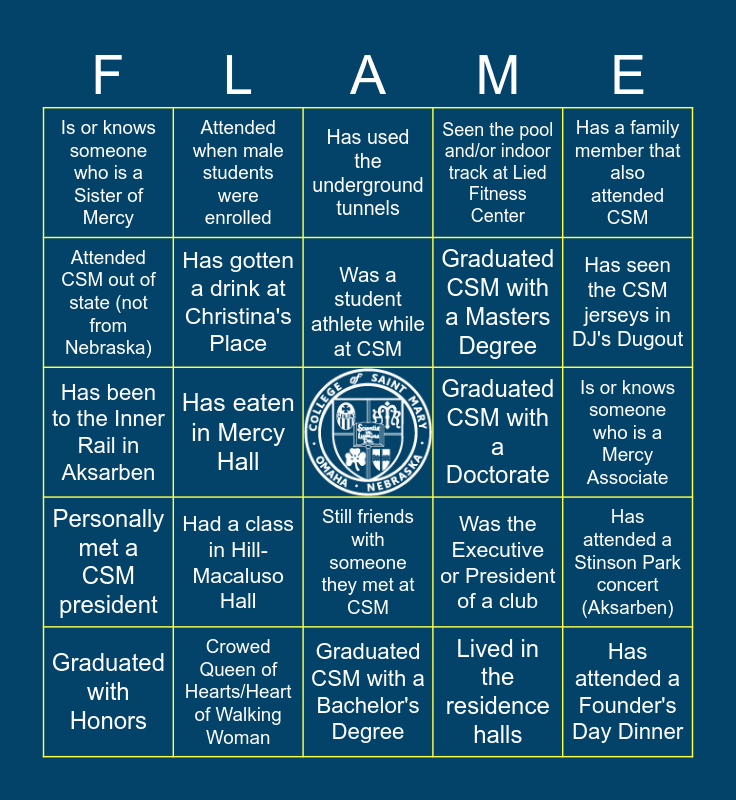 This bingo card has a free space and 24 words: Had a class in Hill-Macaluso Hall, Crowed Queen of Hearts/Heart of Walking Woman, Was a student athlete while at CSM, Graduated with Honors, Has a family member that also attended CSM, Is or knows someone who is a Sister of Mercy, Attended CSM out of state (not from Nebraska), Attended when male students were enrolled, Graduated CSM with a Doctorate, Still friends with someone they met at CSM, Graduated CSM with a Masters Degree, Has been to the Inner Rail in Aksarben, Was the Executive or President of a club, Has attended a Stinson Park concert (Aksarben), Has gotten a drink at Christina's Place, Lived in the residence halls, Is or knows someone who is a Mercy Associate, Has used the underground tunnels, Has seen the CSM jerseys in DJ's Dugout, Has eaten in Mercy Hall, Has attended a Founder's Day Dinner, Personally met a CSM president, Seen the pool and/or indoor track at Lied Fitness Center and Graduated CSM with a Bachelor's Degree.