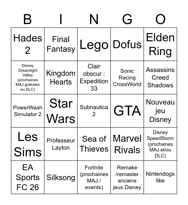 This bingo card has a free space and 24 words: Professeur Layton, Silksong, Clair obscur : Expedition 33, EA Sports FC 26, Elden Ring, Hades 2, Disney Dreamlight Valley (prochaines MAJ gratuites ou DLC), Final Fantasy, GTA, Sea of Thieves, Sonic Racing CrossWorld, PowerWash Simulator 2, Marvel Rivals, Disney SpeedStorm (prochaines MAJ et/ou DLC), Kingdom Hearts, Remake /remaster anciens jeux Disney, Nouveau jeu Disney, Lego, Assassins Creed Shadows, Star Wars, Nintendogs like, Les Sims, Dofus and Fortnite (prochaines MAJ / events).