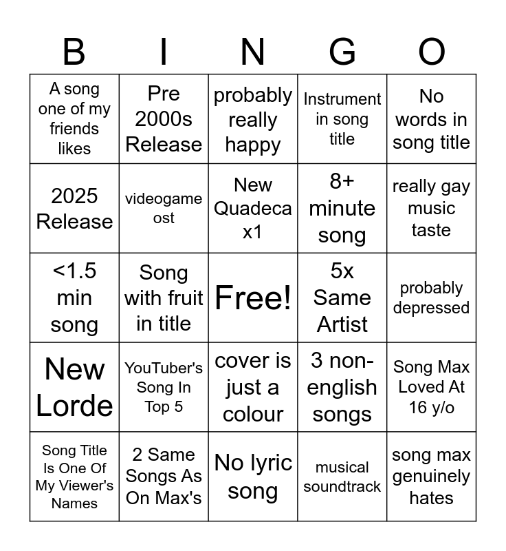 This bingo card has a free space and 24 words: YouTuber's Song In Top 5, 2 Same Songs As On Max's, New Quadeca x1, Song Title Is One Of My Viewer's Names, No words in song title, A song one of my friends likes, 2025 Release, Pre 2000s Release, 5x Same Artist, cover is just a colour, 8+ minute song, <1.5 min song, 3 non-english songs, Song Max Loved At 16 y/o, videogame ost, musical soundtrack, probably depressed, probably really happy, really gay music taste, Song with fruit in title, song max genuinely hates, New Lorde, Instrument in song title and No lyric song.