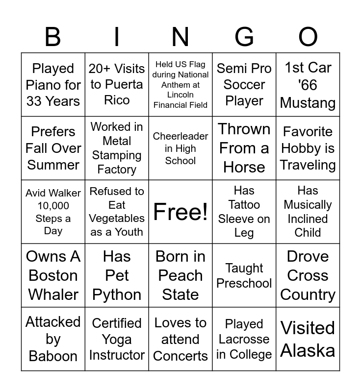 This bingo card has a free space and 24 words: Has Pet Python, Certified Yoga Instructor, Cheerleader in High School, Attacked by Baboon, 1st Car '66 Mustang, Played Piano for 33 Years, Prefers Fall Over Summer, 20+ Visits to Puerta Rico, Has Tattoo Sleeve on Leg, Born in Peach State, Thrown From a Horse, Avid Walker 10,000 Steps a Day, Taught Preschool, Drove Cross Country, Worked in Metal Stamping Factory, Played Lacrosse in College, Has Musically Inclined Child, Held US Flag during National Anthem at Lincoln Financial Field, Favorite Hobby is Traveling, Refused to Eat Vegetables as a Youth, Visited Alaska, Owns A Boston Whaler, Semi Pro Soccer Player and Loves to attend Concerts.