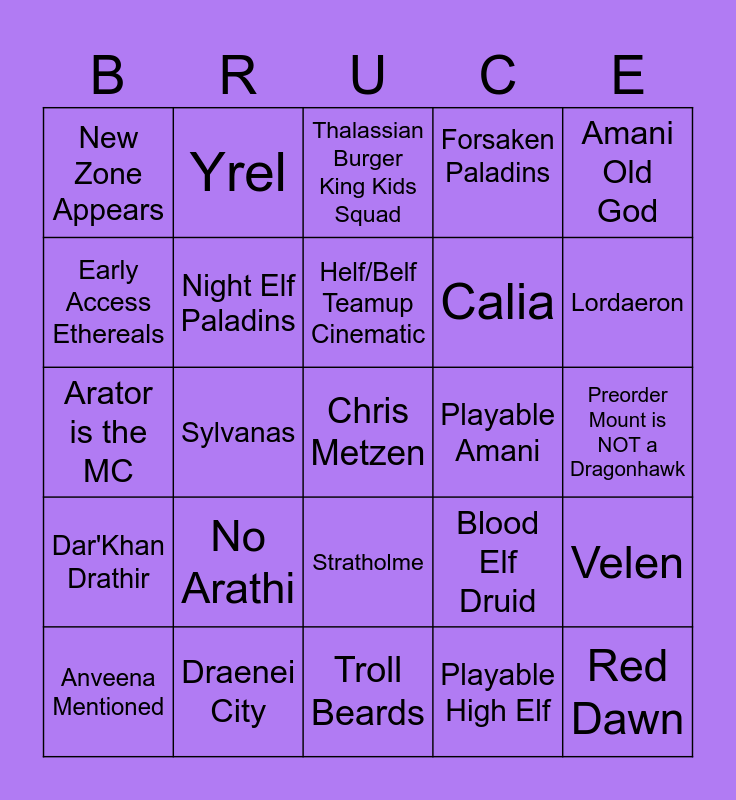 This bingo card has a free space and 24 words: No Arathi, Draenei City, Helf/Belf Teamup Cinematic, Anveena Mentioned, Amani Old God, New Zone Appears, Early Access Ethereals, Yrel, Playable Amani, Stratholme, Calia, Arator is the MC, Blood Elf Druid, Velen, Night Elf Paladins, Playable High Elf, Preorder Mount is NOT a Dragonhawk, Thalassian Burger King Kids Squad, Lordaeron, Sylvanas, Red Dawn, Dar'Khan Drathir, Forsaken Paladins and Troll Beards.