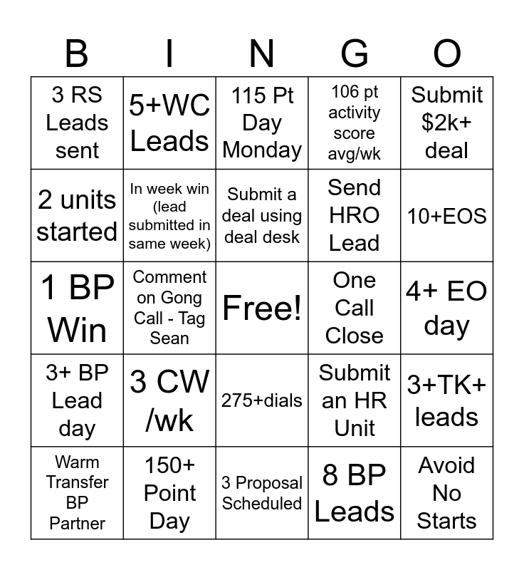This bingo card has a free space and 24 words: 3 CW /wk, 150+ Point Day, Submit a deal using deal desk, Warm Transfer BP Partner, Submit $2k+ deal, 3 RS Leads sent, 2 units started, 5+WC Leads, One Call Close, 275+dials, Send HRO Lead, 1 BP Win, Submit an HR Unit, 3+TK+ leads, In week win (lead submitted in same week), 8 BP Leads, 4+ EO day, 115 Pt Day Monday, 10+EOS, Comment on Gong Call - Tag Sean, Avoid No Starts, 3+ BP Lead day, 106 pt activity score avg/wk and 3 Proposal Scheduled.