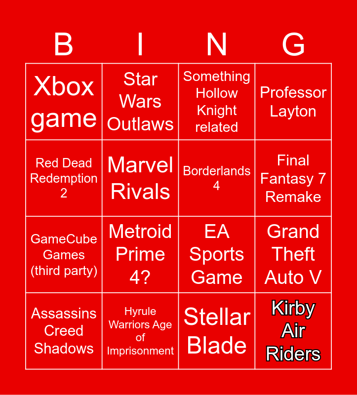 This bingo card has 16 words: Hyrule Warriors Age of Imprisonment, Grand Theft Auto V, Something Hollow Knight related, Xbox game, GameCube Games (third party), Star Wars Outlaws, EA Sports Game, Stellar Blade, Red Dead Redemption 2, Marvel Rivals, Assassins Creed Shadows, Professor Layton, Metroid Prime 4?, Final Fantasy 7 Remake, Borderlands 4 and Kirby Air Riders.
