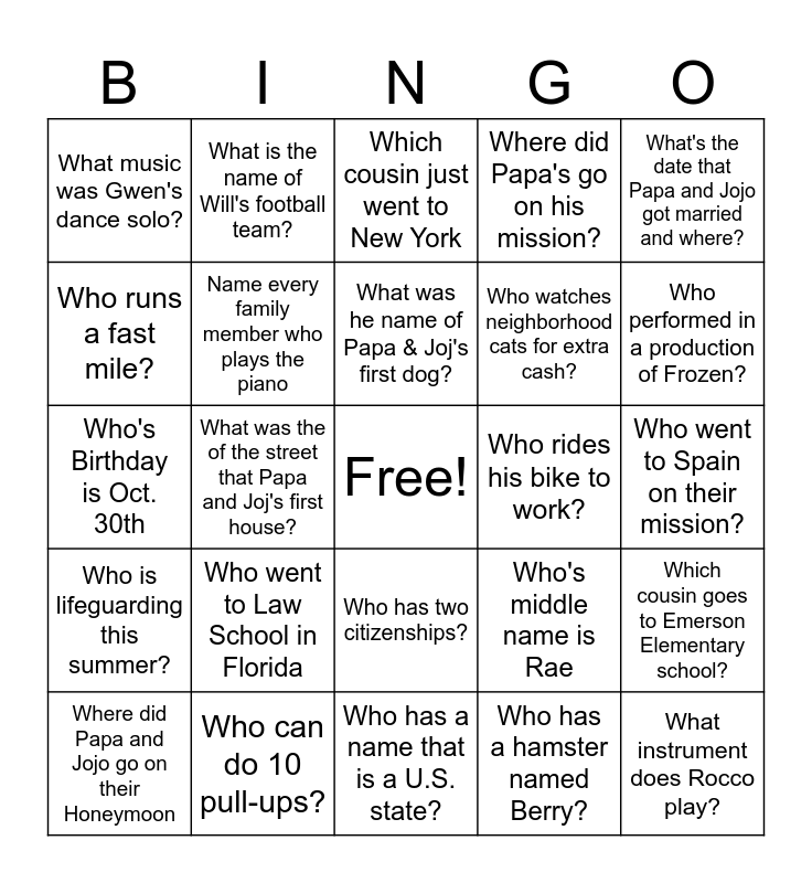 This bingo card has a free space and 29 words: Who makes a mean pancake?, Who can do 10 pull-ups?, Which cousin just went to New York, Whose name has many shades?, What's the date that Papa and Jojo got married and where?, What music was Gwen's dance solo?, Name every family member who plays the piano, What was he name of Papa & Joj's first dog?, Who rides his bike to work?, Which cousin goes to Emerson Elementary school?, Where did Papa and Jojo go on their Honeymoon, What was the of the street that Papa and Joj's first house?, Who has a hamster named Berry?, What instrument does Rocco play?, Who's Birthday is Oct. 30th, Who is living in Oregon?, Who has a name that is a U.S. state?, Who's middle name is Rae, Who performed in a production of Frozen?, Who is lifeguarding this summer?, Who went to Law School in Florida, How many years has Papa & Jojo come to Carlsbad?, Who watches neighborhood cats for extra cash?, Who went to Spain on their mission?, Who runs a fast mile?, What is the name of Will's football team?, Who has two citizenships?, Where did Papa's go on his mission? and Who currently rides his bike to work?.