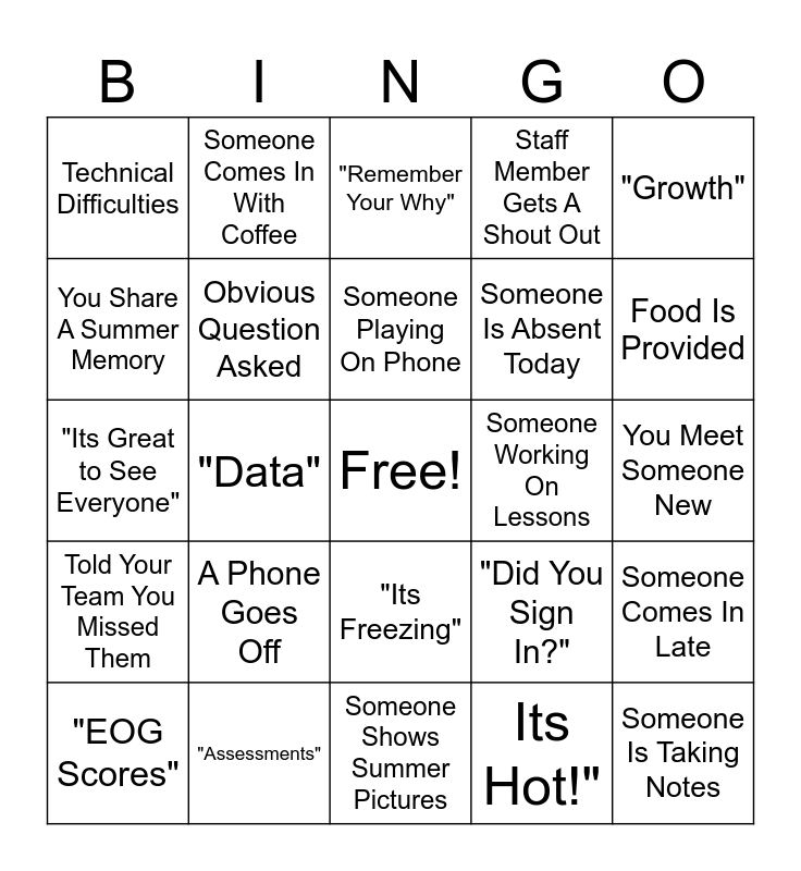 This bingo card has a free space and 38 words: Ice Breaker, Staff Child Appears, Staff Members Applause, Obvious Question Asked, Someone Comes In Late, A Phone Goes Off, Someone Playing On Phone, Someone Shares A Funny Story, "Growth", Someone Is Absent Today, "Data", Staff Member Gets A Shout Out, Someone Is Taking Notes, You Meet Someone New, You Share A Summer Memory, Told Your Team You Missed Them, "Avid", "Remember Your Why", Spot A Laptop Sticker, Someone Working On Lessons, Technical Difficulties, "Assessments", Food Is Provided, "EOG Scores", "Rigor", Someone Shows Summer Pictures, "Lets Break Into Groups", Someone Sneezes, Bathroom Break Is Given, TEAMS Is Mentioned, Someone Keeps Coughing, "Its Freezing", Its Hot!", Someone Comes In With Coffee, Someone Comes In With Tea, "Did You Sign In?", "Its Great to See Everyone" and Groups Are Asked To Read Aloud.