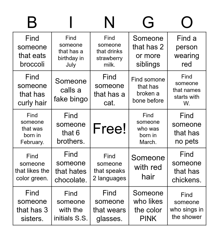This bingo card has a free space and 29 words: Find someone named Parker, Find someone with the initials S.S., Find someone that drinks strawberry milk., Find someone that has been to Alabama, Find a person wearing red, Find someone that eats broccoli, Someone calls a fake bingo, Find someone that has a cat., Find someone who was born in March., Find someone that has chickens., Find someone that has 3 sisters., Find someone that 6 brothers., Someone who likes the color PINK, Find someone who sings in the shower, Find someone that was born in February., Find someone that has 5 siblings., Find someone that wears glasses., Someone with red hair, Find someone that names starts with W., Find someone that likes the color green., Find someone that hates chocolate., Find someone left handed, Find somone that has broken a bone before, Find someone that has no pets, Find someone that has curly hair, Find someone that has a birthday in July, Find someone that speaks 2 languages, Someone that has 2 or more siblings and Someone that is the youngest child.