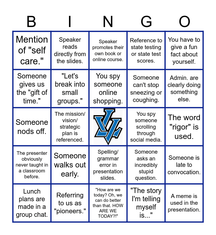 This bingo card has a free space and 39 words: There is an ice breaker., Someone drops/spills their snack., Technical difficulties., "Let's break into small groups.", Lunch plans are made in a group chat., Spelling/ grammar error in presentation slides., You spy someone online shopping., The presenter shares an "inspirational" story., You have to give a fun fact about yourself., The presenter obviously never taught in a classroom before., The mission/ vision/ strategic plan is referenced., Reference to state testing or state test scores., A meme is used in the presentation., The word "rigor" is used., You spy someone scrolling through social media., Someone walks out early., Snacks are provided., Mention of "self care.", The presenter makes a lame "relatable" joke., Someone asks an incredibly stupid question., Someone gives us the "gift of time.", "How are we today? Oh, we can do better than that. HOW ARE WE TODAY?!", Someone can't stop sneezing or coughing., Admin. are clearly doing something else., Speaker tells you to do something the district would never pay for., Sit through training/speaker for the wrong age group., Presenter doesn't use the mic because they have a "loud voice.", Gallery walk., Any TED video is shown., Speaker reads directly from the slides., "Remember your why.", A new acronym for an already established thing is given., Speaker promotes their own book or online course., Referring to us as "pioneers.", "The story I'm telling myself is...", Exit ticket., Someone is late to convocation., Someone nods off. and Go over PRIDE acronym..