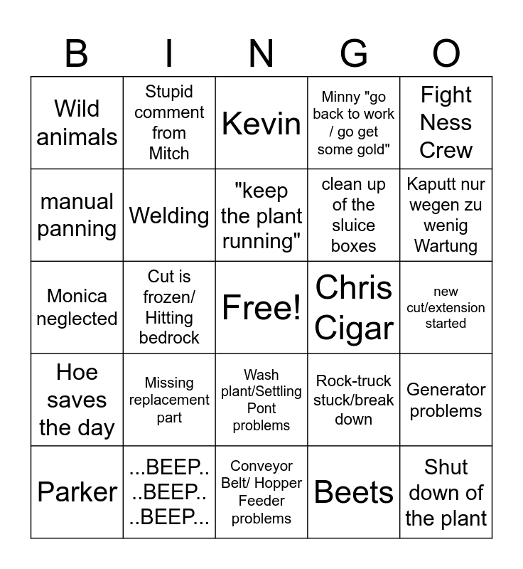This bingo card has a free space and 43 words: "Gold Prices at an all time high", Shut down of the plant, Rock-truck breaks down, Parker, Rick, Beets, Kevin, Cut Flooding, Fight Ness Crew, ...BEEP.. ..BEEP.. ..BEEP..., Minny "go back to work / go get some gold", Chris Cigar, Wash plant/Settling Pont problems, Missing replacement part, New operator, Conveyor Belt/ Hopper Feeder problems, "Kouseng Mike", Monica neglected, 500 Ounces of Gold, Kaputt nur wegen zu wenig Wartung, Stupid comment from Mitch, Pump problems, equipment bought, Wild animals, new cut tested, new cut/extension started, cut finished, "hit pay", Rock-truck stuck/break down, Hoe saves the day, Running out of pay/ stockpile runs out, Generator problems, Hoe/ Dozer problems, Cut is frozen/ Hitting bedrock, "operation at a stand still", equipment repaired, group meeting/ discussion in person, "keep the plant running", manual panning, clean up of the sluice boxes, "I'm stuck", Welding and Start up of a wash plant/ "Fire up".