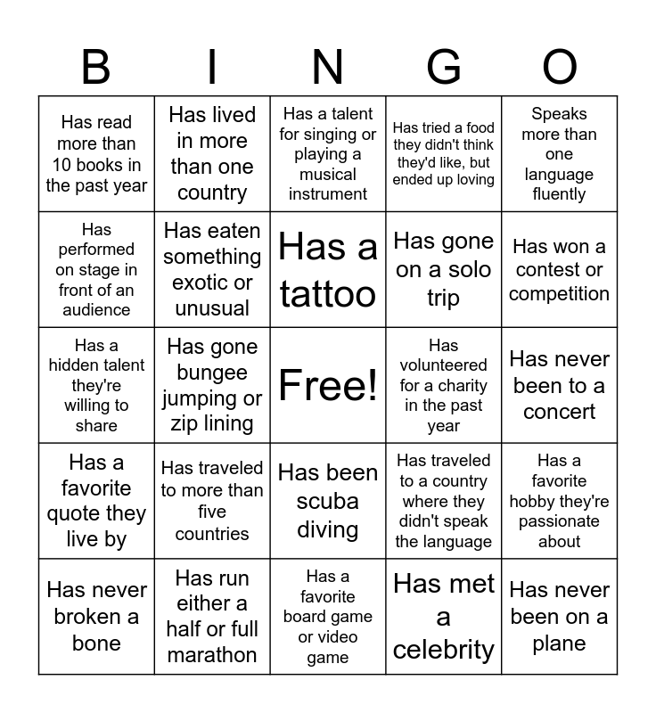 This bingo card has a free space and 24 words: Has traveled to more than five countries, Has run either a half or full marathon, Has a tattoo, Has never broken a bone, Speaks more than one language fluently, Has read more than 10 books in the past year, Has performed on stage in front of an audience, Has lived in more than one country, Has volunteered for a charity in the past year, Has been scuba diving, Has gone on a solo trip, Has a hidden talent they're willing to share, Has traveled to a country where they didn't speak the language, Has a favorite hobby they're passionate about, Has eaten something exotic or unusual, Has met a celebrity, Has never been to a concert, Has a talent for singing or playing a musical instrument, Has won a contest or competition, Has gone bungee jumping or zip lining, Has never been on a plane, Has a favorite quote they live by, Has tried a food they didn't think they'd like, but ended up loving and Has a favorite board game or video game.