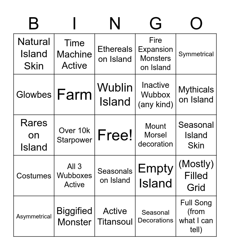 This bingo card has a free space and 24 words: All 3 Wubboxes Active, Biggified Monster, Wublin Island, Asymmetrical, Symmetrical, Natural Island Skin, Glowbes, Time Machine Active, Mount Morsel decoration, Seasonals on Island, Inactive Wubbox (any kind), Rares on Island, Empty Island, (Mostly) Filled Grid, Farm, Seasonal Decorations, Seasonal Island Skin, Ethereals on Island, Mythicals on Island, Over 10k Starpower, Full Song (from what I can tell), Costumes, Fire Expansion Monsters on Island and Active Titansoul.