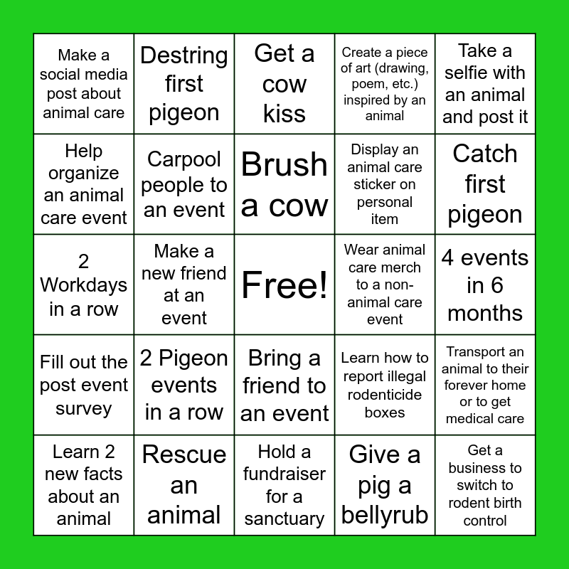 This bingo card has a free space and 24 words: 2 Pigeon events in a row, Rescue an animal, Brush a cow, Learn 2 new facts about an animal, Take a selfie with an animal and post it, Make a social media post about animal care, Help organize an animal care event, Destring first pigeon, Wear animal care merch to a non-animal care event, Bring a friend to an event, Display an animal care sticker on personal item, 2 Workdays in a row, Learn how to report illegal rodenticide boxes, Transport an animal to their forever home or to get medical care, Carpool people to an event, Give a pig a bellyrub, 4 events in 6 months, Get a cow kiss, Catch first pigeon, Make a new friend at an event, Get a business to switch to rodent birth control, Fill out the post event survey, Create a piece of art (drawing, poem, etc.) inspired by an animal and Hold a fundraiser for a sanctuary.
