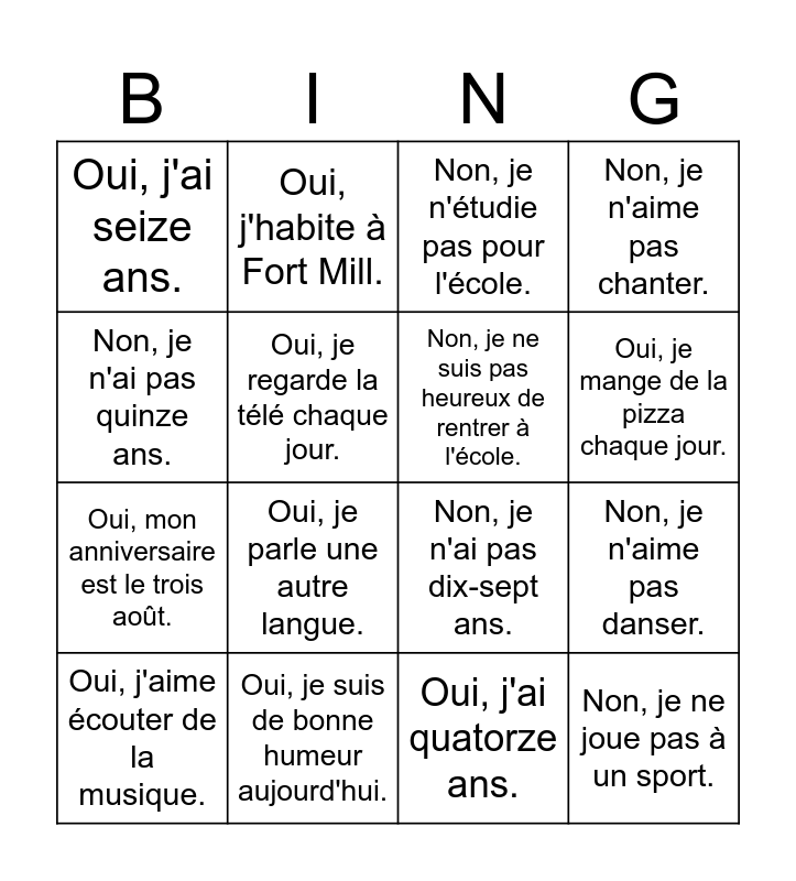 This bingo card has 20 words: Non, je n'aime pas danser., Oui, mon anniversaire est le deux juin., Non, je n'étudie pas pour l'école., Non, mon anniversaire n'est pas le trente janvier., Oui, j'aime écouter de la musique., Non, je n'ai pas quinze ans., Oui, je suis de bonne humeur aujourd'hui., Oui, j'ai seize ans., Oui, mon anniversaire est le trois août., Oui, j'habite à Fort Mill., Oui, je parle une autre langue., Non, je n'ai pas dix-sept ans., Oui, je regarde la télé chaque jour., Non, je ne joue pas à un sport., Non, je ne suis pas heureux de rentrer à l'école., Oui, j'aime participer en classe., Oui, je mange de la pizza chaque jour., Non, je n'aime pas chanter., Oui, j'ai quatorze ans. and Oui, j'habite à Paris..