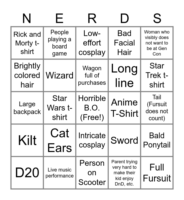 This bingo card has a free space and 25 words: Cat Ears, Person on Scooter, Wagon full of purchases, D20, Woman who visibly does not want to be at Gen Con, Rick and Morty t-shirt, Brightly colored hair, People playing a board game, Anime T-Shirt, Intricate cosplay, Long line, Large backpack, Sword, Bald Ponytail, Wizard, Elf cosplay, Tail (Fursuit does not count), Low-effort cosplay, Star Trek t-shirt, Star Wars t-shirt, Full Fursuit, Live music performance, Kilt, Bad Facial Hair and Parent trying very hard to make their kid enjoy DnD, etc..