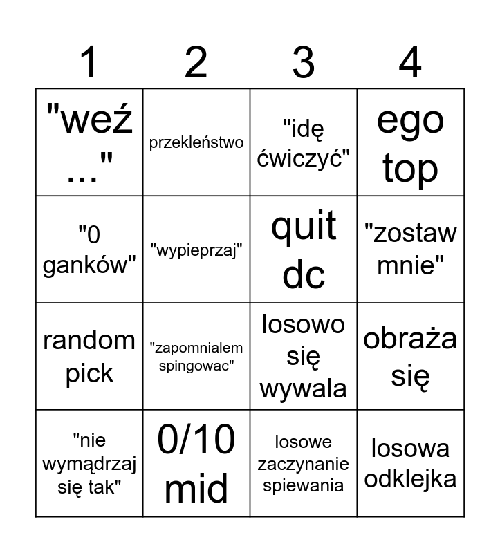 This bingo card has 16 words: 0/10 mid, obraża się, "idę ćwiczyć", "weź ...", random pick, przekleństwo, losowo się wywala, losowe zaczynanie spiewania, "0 ganków", "wypieprzaj", "nie wymądrzaj się tak", ego top, "zapomnialem spingowac", "zostaw mnie", quit dc and losowa odklejka.