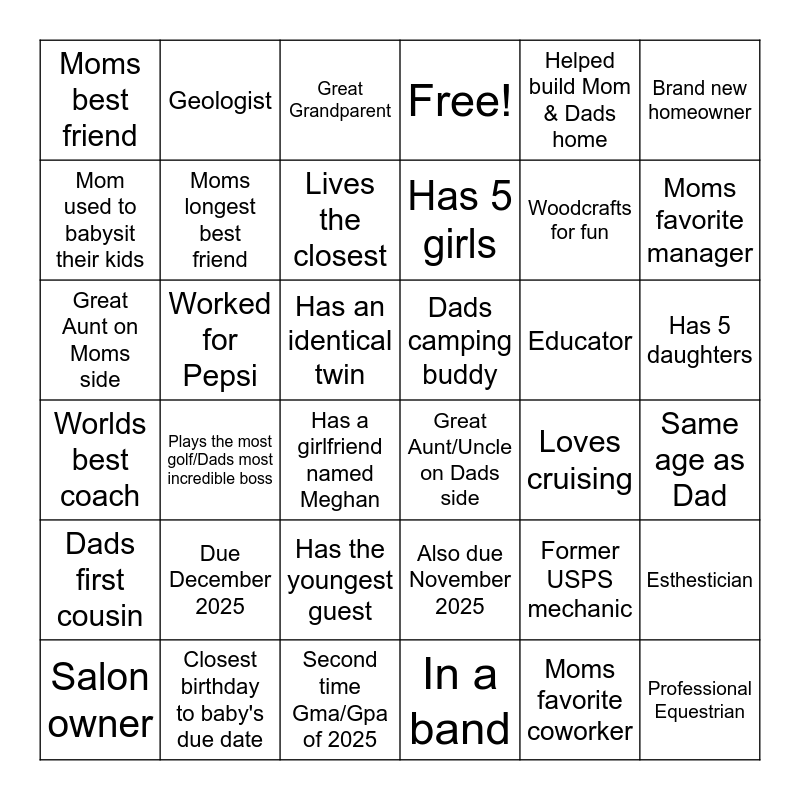 This bingo card has 36 words: Also due November 2025, Has the youngest guest, In a band, Mom used to babysit their kids, Worlds best coach, Dads camping buddy, Moms longest best friend, Second time Gma/Gpa of 2025, Helped build Mom & Dads home, Former USPS mechanic, Moms favorite manager, Free!, Esthestician, Worked for Pepsi, Has 5 girls, Moms best friend, Dads first cousin, Educator, Great Aunt on Moms side, Great Grandparent, Has an identical twin, Plays the most golf/Dads most incredible boss, Great Aunt/Uncle on Dads side, Has a girlfriend named Meghan, Loves cruising, Geologist, Woodcrafts for fun, Closest birthday to baby's due date, Lives the closest, Brand new homeowner, Professional Equestrian, Salon owner, Same age as Dad, Has 5 daughters, Due December 2025 and Moms favorite coworker.