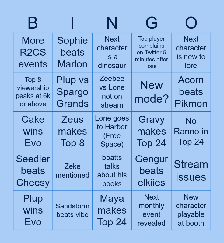 This bingo card has a free space and 24 words: Zeke mentioned, Sandstorm beats vibe, Zeebee vs Lone not on stream, Plup wins Evo, Next character is new to lore, More R2CS events, Top 8 viewership peaks at 6k or above, Sophie beats Marlon, Gravy makes Top 24, bbatts talks about his books, New mode?, Cake wins Evo, Gengur beats elkiies, Stream issues, Plup vs Spargo Grands, Next monthly event revealed, No Ranno in Top 24, Next character is a dinosaur, Acorn beats Pikmon, Zeus makes Top 8, New character playable at booth, Seedler beats Cheesy, Top player complains on Twitter 5 minutes after loss and Maya makes Top 24.