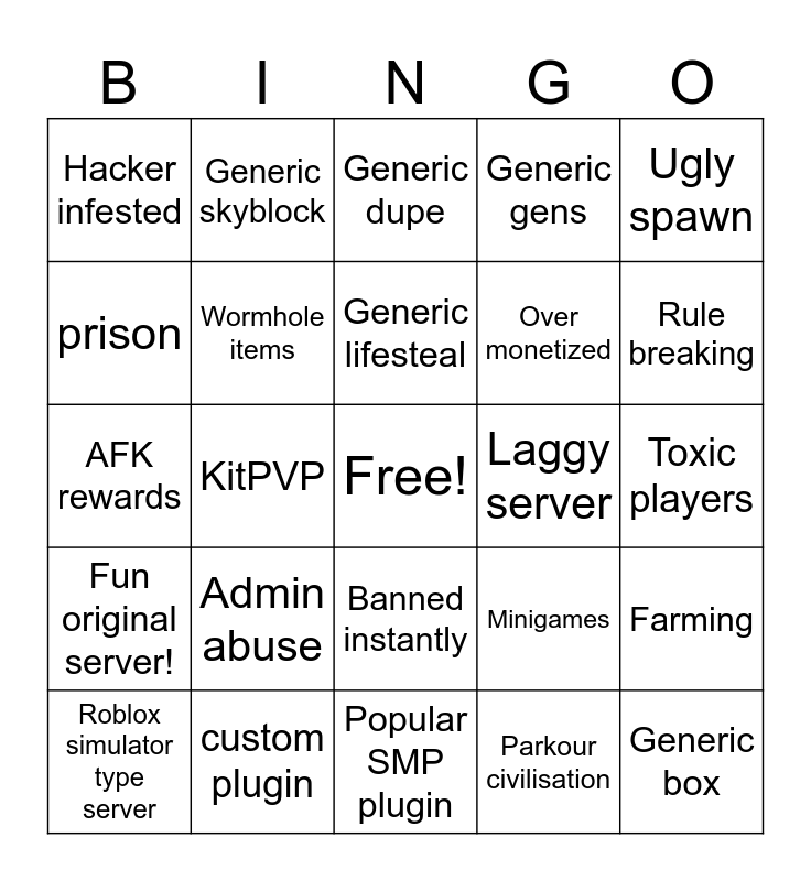 This bingo card has a free space and 24 words: Admin abuse, custom plugin, Generic lifesteal, Roblox simulator type server, Ugly spawn, Hacker infested, prison, Generic skyblock, Laggy server, Banned instantly, Over monetized, AFK rewards, Minigames, Farming, Wormhole items, Parkour civilisation, Toxic players, Generic dupe, Rule breaking, KitPVP, Generic box, Fun original server!, Generic gens and Popular SMP plugin.