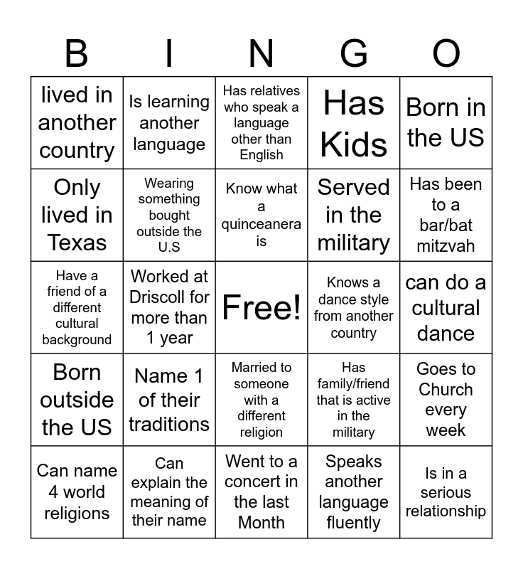 This bingo card has a free space and 34 words: Has visited another country, Speaks another language fluently, Friends or family in another country, Enjoys music in another language, Born outside the US, Wearing something bought outside the U.S, Born in the US, Can name 4 world religions, Is learning another language, Can identify 3 countries flags, Know what a quinceanera is, Has relatives who speak a language other than English, Traveled to Europe, Studied in a foreign country, Knows a dance style from another country, Has been to a bar/bat mitzvah, Can explain the meaning of their name, Have a friend of a different cultural background, Name 1 of their traditions, Has family/friend that is active in the military, Married to someone with a different religion, Is a vegetarian, lived in another country, can do a cultural dance, Went to a concert in the last Month, Is in a serious relationship, Has Kids, Graduated College, Served in the military, Only lived in Texas, Voted in the last election, Worked at Driscoll for more than 1 year, Goes to Church every week and Can Name 3 Broadway Musicals.