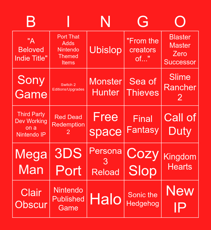 This bingo card has a free space and 24 words: 3DS Port, Nintendo Published Game, Monster Hunter, Clair Obscur, Blaster Master Zero Successor, "A Beloved Indie Title", Sony Game, Port That Adds Nintendo Themed Items, Final Fantasy, Persona 3 Reload, Sea of Thieves, Third Party Dev Working on a Nintendo IP, Cozy Slop, Kingdom Hearts, Switch 2 Editions/Upgrades, Sonic the Hedgehog, Call of Duty, Ubislop, Slime Rancher 2, Red Dead Redemption 2, New IP, Mega Man, "From the creators of..." and Halo.