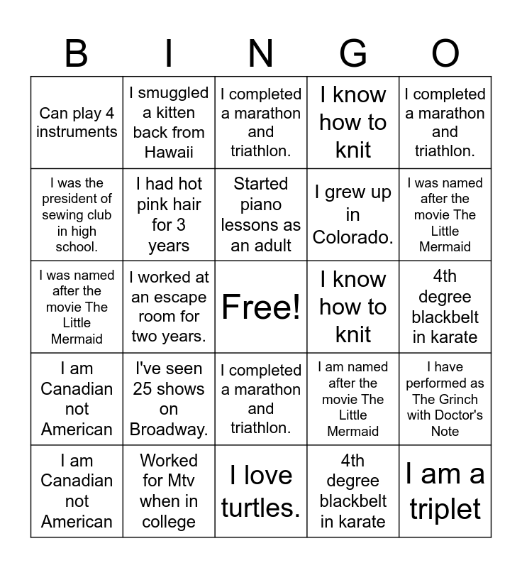 ⚠ This card has duplicate items: Worked for Mtv when in college. (4), My alarm clock is my pet rooster named RooPaul. (4), Auditioned for Chopped on Food Network (5), I grew up in Colorado. (4), I've lived in many cities (5), I was the president of sewing club in high school. (4), I worked at an escape room for two years. (4), Enjoy pareidolia (5), 4th degree blackbelt in karate (5), I have performed as The Grinch with Doctor's Note (5), I am Canadian not American (5), Spelunker who used single rope technique (5), I live in South Philly (5), I used to be a solo singer for my med school choir (5), Volunteers at a cat rescue (5), I smuggled a kitten back from Hawaii. (4), Driver in a Vice Presidential motorcade (5), I love turtles. (4), I know how to knit (5), I completed a marathon and triathlon. (4), I've seen 25 shows on Broadway. (5), Edit Wikipedia (4), Can play 4 instruments (2), I have a cat who zooms with me (2), Started piano lessons as an adult (2), I was named after the movie The Little Mermaid (3), I am a triplet (4), I had hot pink hair for 3 years (4)