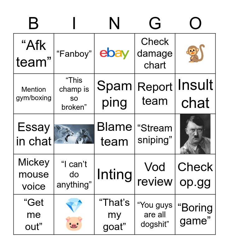 This bingo card has 3 images, a free space and 21 words: “I can’t do anything”, 💎🐷, Spam ping, “Get me out”, 🐒, “Afk team”, Mention gym/boxing, “Fanboy”, “Stream sniping”, Inting, Report team, Essay in chat, Vod review, Check op.gg, “This champ is so broken”, “You guys are all dogshit”, Insult chat, “Boring game”, Mickey mouse voice, Check damage chart and “That’s my goat”.