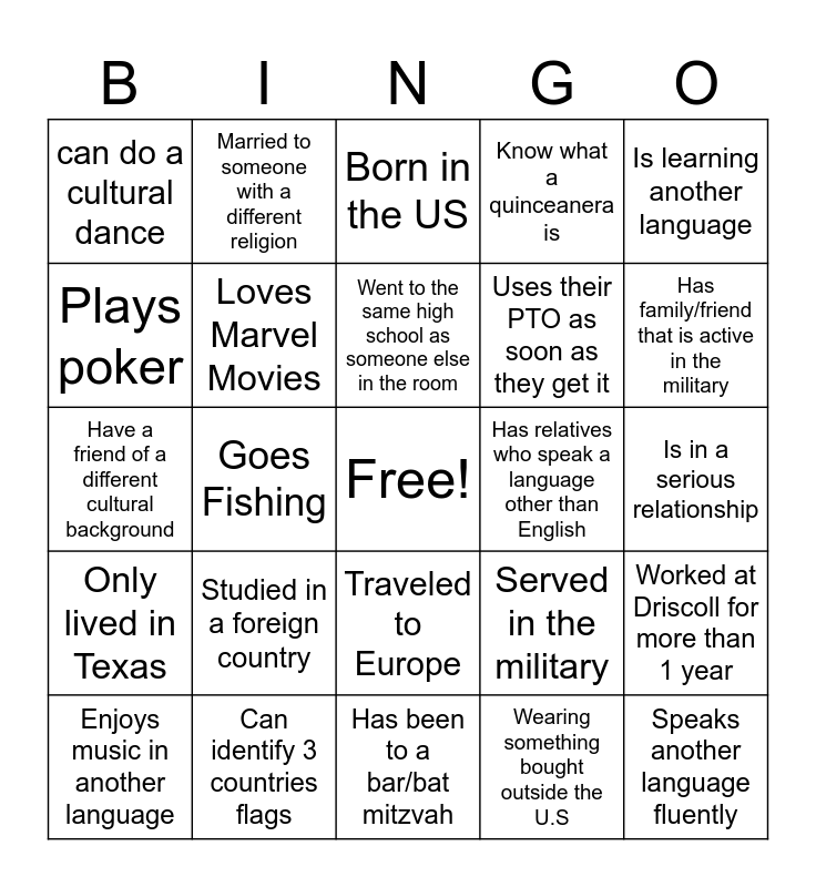 This bingo card has a free space and 44 words: Has visited another country, Speaks another language fluently, Friends or family in another country, Enjoys music in another language, Born outside the US, Wearing something bought outside the U.S, Born in the US, Can name 4 world religions, Is learning another language, Can identify 3 countries flags, Know what a quinceanera is, Has relatives who speak a language other than English, Traveled to Europe, Studied in a foreign country, Knows a dance style from another country, Has been to a bar/bat mitzvah, Can explain the meaning of their name, Have a friend of a different cultural background, Name 1 of their traditions, Has family/friend that is active in the military, Married to someone with a different religion, Is a vegetarian, lived in another country, can do a cultural dance, Went to a concert in the last Month, Is in a serious relationship, Has Kids, Graduated College, Served in the military, Only lived in Texas, Voted in the last election, Worked at Driscoll for more than 1 year, Goes to Church every week, Can Name 3 Broadway Musicals, Goes Fishing, Likes to Hunt, Loves to Sing, Likes to Play Board games, Went to the same high school as someone else in the room, Plays poker, Uses their PTO as soon as they get it, Hoards their PTO, Loves Marvel Movies and Think DC Comics are Better.