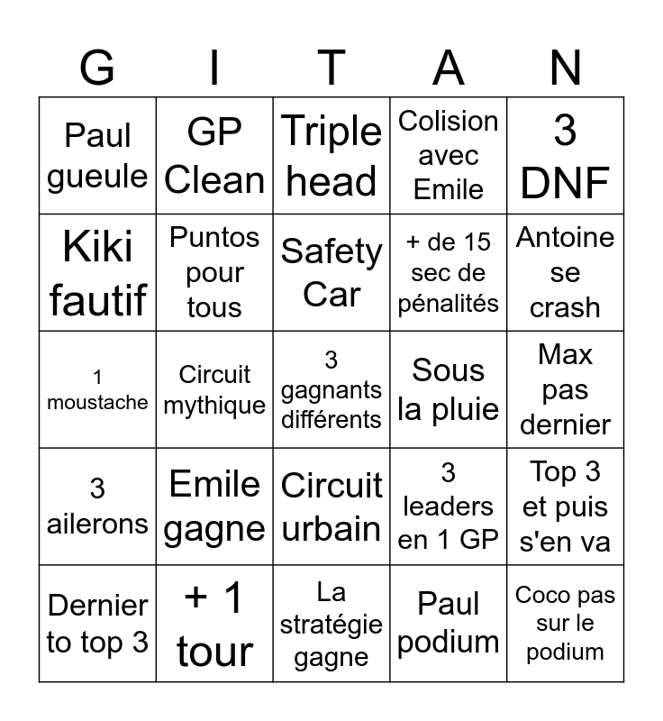 This bingo card has a free space and 24 words: Emile gagne, + 1 tour, Safety Car, Dernier to top 3, 3 DNF, Paul gueule, Kiki fautif, GP Clean, Sous la pluie, Circuit urbain, + de 15 sec de pénalités, 1 moustache, 3 leaders en 1 GP, Top 3 et puis s'en va, Puntos pour tous, Paul podium, Max pas dernier, Triple head, Antoine se crash, Circuit mythique, Coco pas sur le podium, 3 ailerons, Colision avec Emile and La stratégie gagne.