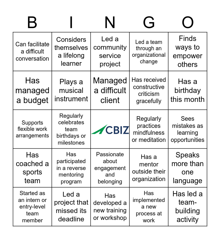 This bingo card has a free space and 121 words: Has led a team meeting this month, Has visited more than three CBIZ offices, Enjoys public speaking, Has managed a remote team, Mentored someone this year, Believes in servant leadership, Led a team through an organizational change, Volunteered for a tough project, Speaks more than one language, Gave someone feedback this week, Reads leadership books or listens to leadership podcasts, Worked at the company for over 10 years, Presented to an executive team, Changed careers at least once, Lived or worked abroad, Took a risk at work that paid off, Passionate about engagement and belonging, Led a cross-functional project, Experienced a merger or acquisition, Promoted within the last year, Started as an intern or entry-level team member, Led a community service project, Participates in a professional association, Received a leadership award, Is the first in their family to be a director, Has coached a sports team, Led a project that missed its deadline, Learned something new from a junior team member, Celebrates small wins with their team, Has facilitated a training session, Has implemented a new process at work, Regularly celebrates team birthdays or milestones, Managed a difficult client, Works regularly with international team member, Has run a virtual meeting for more than 20 people, Has presented at a conference, Is part of an employee resource group (ERG), Led a brainstorming session, Has led a project with a cross-generational team, Comfortable with ambiguity, Collaborated with another department on a project, Regularly uses data to make decisions, Has received a “thank you” note from a colleague, Received 360-degree feedback, Sets personal leadership goals, Volunteers outside of work, Started a new team tradition, Regularly practices mindfulness or meditation, Believes in “leading by example”, Has delivered tough news to a team, Enjoys problem-solving, Has inspired someone else to lead, Has a mentor outside their organization, Participates in peer coaching, Has posted a professional update or article on LinkedIn in the past month, Learned from a major failure, Has taken a course on emotional intelligence, Regularly shares industry news on LinkedIn, Can describe their leadership philosophy, Considers themselves a lifelong learner, Works best under pressure, Delegates tasks regularly, Encourages others to speak up, Has helped onboard a new employee, Prefers face-to-face communication, Has managed a budget, Led a team during a crisis, Uses humor to connect with others, Has introduced a new technology at work, Has worked in more than one country, Supports flexible work arrangements, Reflects on their leadership style regularly, Enjoys mentoring others, Has given a keynote speech, Encourages feedback from their team, Has received constructive criticism gracefully, Values team collaboration, Recognizes and rewards good work, Advocates for work-life balance, Has led a team-building activity, Has participated in a reverse mentoring program, Can facilitate a difficult conversation, Enjoys cross-cultural experiences, Prefers to plan ahead, Likes to challenge the status quo, Has worked on a start-up or entrepreneurial venture, Has served on a board or committee, Believes in continuous improvement, Sees mistakes as learning opportunities, Regularly sets aside time for reflection, Can quickly adapt to change, Builds trust within their team, Has developed a new training or workshop, Uses storytelling in communication, Has networked with people outside their industry, Values different perspectives, Creates opportunities for others, Invests in their own growth, Finds ways to empower others, Is passionate about leadership development, Speaks more than two languages, Has a pet, Loves to cook or bake, Has run a marathon or 5K, Plays a musical instrument, Has met someone famous, Was born in the same month as you, Is left-handed, Has lived in more than three states, Is an only child, Has worked at the company for less than a year, Has a hidden talent, Watched a movie this week, Has read more than five books this year, Loves spicy food, Has a birthday this month, Has attended a concert in the past year, Prefers coffee over tea, Loves to dance, Has a funny ringtone and Has gone camping.