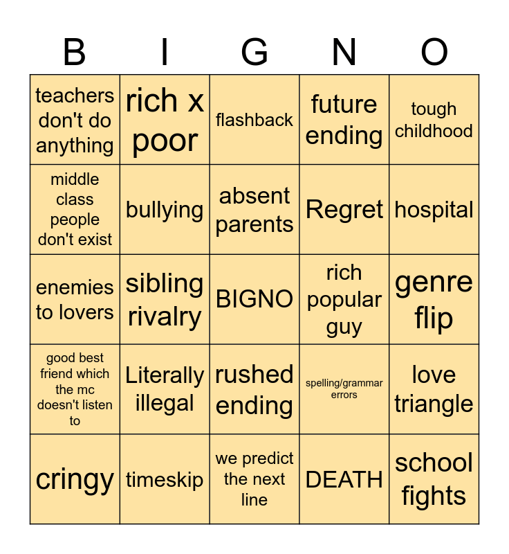 This bingo card has a free space and 24 words: Literally illegal, timeskip, absent parents, cringy, tough childhood, teachers don't do anything, middle class people don't exist, rich x poor, rich popular guy, rushed ending, Regret, enemies to lovers, spelling/grammar errors, love triangle, bullying, DEATH, genre flip, flashback, hospital, sibling rivalry, school fights, good best friend which the mc doesn't listen to, future ending and we predict the next line.