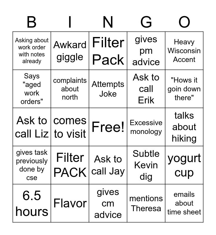 This bingo card has a free space and 24 words: Filter PACK, Flavor, Attempts Joke, 6.5 hours, Heavy Wisconsin Accent, Asking about work order with notes already, Says "aged work orders", Awkard giggle, Excessive monology, Ask to call Jay, Ask to call Erik, Ask to call Liz, Subtle Kevin dig, yogurt cup, complaints about north, mentions Theresa, talks about hiking, Filter Pack, "Hows it goin down there", comes to visit, emails about time sheet, gives task previously done by cse, gives pm advice and gives cm advice.