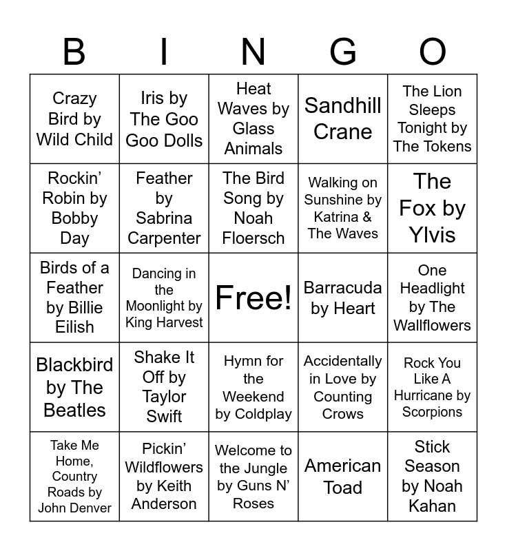 This bingo card has a free space and 75 words: Daylight by Harry Styles, Free Bird by MOONLGHT, Heat Waves by Glass Animals, Wild Thing by The Troggs, Forestry by Day We Ran, Riptide by Vance Joy, Birding by Swet Shop Boys, Rattlesnake, Fly Away by Lenny Kravits, Snow by Red Hot Chili Peppers, Wildflowers and Wild Horses by Lainey Wilson, Beneath Oak Trees by Dylan Gossett, The Bird Song by Noah Floersch, Rockin’ Robin by Bobby Day, Shrike by Hozier, Dancing in the Moonlight by King Harvest, The Chicken in Black by Johnny Cash, Stick Season by Noah Kahan, Northern Cardinal, The Lion Sleeps Tonight by The Tokens, Ragged Wood by Fleet Foxes, Birds of a Feather by Billie Eilish, Feather by Sabrina Carpenter, Iris by The Goo Goo Dolls, Sandhill Crane, Trees and Flowers by Strawberry Switchblade, American Robin, Three Little Birds by Bob Marley & The Wailers, Surfin’ Bird by The Trashmen, Where’d All the Time Go by Bird and Byron, Foxglove by Haley Heynderickx, Wildlife by Alice Ivy, Squirrels by Mipso, Accidentally in Love by Counting Crows, The Fox by Ylvis, Walking on Sunshine by Katrina & The Waves, Hotel California by Eagles, Choking on Flowers by Fox Academy, One Headlight by The Wallflowers, American Toad, Edge of Seventeen by Stevie Nicks, Flowers by Miley Cyrus, Wildflowers by Trampled by Turtles, Mockingbird Song by Caamp, Mr. Jones by Counting Crows, Mr. Blue Sky by Weezer, Take Me Home, Country Roads by John Denver, Crazy Bird by Wild Child, Talking to the Moon by Bruno Mars, I Like Birds by Eels, Take it Easy by Eagles, Hymn for the Weekend by Coldplay, Cruel Summer by Taylor Swift, Wildflowers by Tom Petty, Painted Sky by The National Parks, Waterfalls by TLC, Red Fox, Fox Hunt by Sierra Ferrell, Lover by Taylor Swift, Ain’t No Mountain High Enough by Marvin Gaye, Shake It Off by Taylor Swift, Ivy by Taylor Swift, Roses by Outkast, Turn! Turn! Turn! by The Byrds, Passerine by The Oh Hellos, Barracuda by Heart, Red-tailed Hawk, Hip Hop Hooray by Naughty by Nature, Red Dirt Road by Brooks & Dunn, Rock You Like A Hurricane by Scorpions, Blackbird by The Beatles, Pickin’ Wildflowers by Keith Anderson, Fishin’ in the Dark by Nitty Gritty Dirt Band, Welcome to the Jungle by Guns N’ Roses and September by Earth, Wind & Fire.
