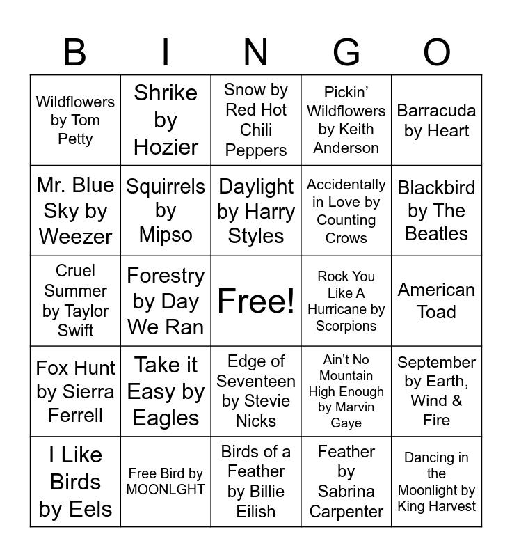 This bingo card has a free space and 75 words: Surfin’ Bird by The Trashmen, Wildlife by Alice Ivy, Snow by Red Hot Chili Peppers, Hip Hop Hooray by Naughty by Nature, Ivy by Taylor Swift, Shake It Off by Taylor Swift, Take Me Home, Country Roads by John Denver, Sandhill Crane, Northern Cardinal, Welcome to the Jungle by Guns N’ Roses, Lover by Taylor Swift, Wild Thing by The Troggs, Daylight by Harry Styles, Mr. Blue Sky by Weezer, Foxglove by Haley Heynderickx, Forestry by Day We Ran, The Chicken in Black by Johnny Cash, Dancing in the Moonlight by King Harvest, Talking to the Moon by Bruno Mars, Barracuda by Heart, Iris by The Goo Goo Dolls, Cruel Summer by Taylor Swift, Squirrels by Mipso, Shrike by Hozier, Pickin’ Wildflowers by Keith Anderson, Walking on Sunshine by Katrina & The Waves, Ragged Wood by Fleet Foxes, The Lion Sleeps Tonight by The Tokens, Mr. Jones by Counting Crows, American Robin, Roses by Outkast, Passerine by The Oh Hellos, One Headlight by The Wallflowers, Ain’t No Mountain High Enough by Marvin Gaye, Blackbird by The Beatles, Accidentally in Love by Counting Crows, Waterfalls by TLC, Painted Sky by The National Parks, American Toad, Feather by Sabrina Carpenter, Riptide by Vance Joy, Wildflowers by Trampled by Turtles, Rockin’ Robin by Bobby Day, Birding by Swet Shop Boys, Flowers by Miley Cyrus, Three Little Birds by Bob Marley & The Wailers, I Like Birds by Eels, Wildflowers by Tom Petty, Hotel California by Eagles, Beneath Oak Trees by Dylan Gossett, Choking on Flowers by Fox Academy, Edge of Seventeen by Stevie Nicks, The Fox by Ylvis, Where’d All the Time Go by Bird and Byron, Fishin’ in the Dark by Nitty Gritty Dirt Band, Crazy Bird by Wild Child, Trees and Flowers by Strawberry Switchblade, The Bird Song by Noah Floersch, Mockingbird Song by Caamp, Red Dirt Road by Brooks & Dunn, Take it Easy by Eagles, Heat Waves by Glass Animals, Red Fox, Turn! Turn! Turn! by The Byrds, Wildflowers and Wild Horses by Lainey Wilson, Rock You Like A Hurricane by Scorpions, Hymn for the Weekend by Coldplay, Stick Season by Noah Kahan, Rattlesnake, September by Earth, Wind & Fire, Fox Hunt by Sierra Ferrell, Free Bird by MOONLGHT, Red-tailed Hawk, Birds of a Feather by Billie Eilish and Fly Away by Lenny Kravits.