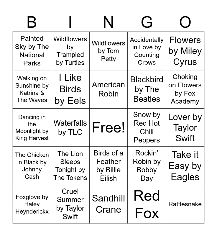 This bingo card has a free space and 75 words: Free Bird by MOONLGHT, One Headlight by The Wallflowers, Wildflowers by Tom Petty, Crazy Bird by Wild Child, Squirrels by Mipso, Three Little Birds by Bob Marley & The Wailers, Iris by The Goo Goo Dolls, Roses by Outkast, Fox Hunt by Sierra Ferrell, Where’d All the Time Go by Bird and Byron, Shake It Off by Taylor Swift, The Fox by Ylvis, American Robin, Walking on Sunshine by Katrina & The Waves, Wildlife by Alice Ivy, Waterfalls by TLC, Heat Waves by Glass Animals, Rattlesnake, Wildflowers and Wild Horses by Lainey Wilson, Flowers by Miley Cyrus, Pickin’ Wildflowers by Keith Anderson, Dancing in the Moonlight by King Harvest, I Like Birds by Eels, Wildflowers by Trampled by Turtles, Accidentally in Love by Counting Crows, Stick Season by Noah Kahan, Forestry by Day We Ran, Fishin’ in the Dark by Nitty Gritty Dirt Band, September by Earth, Wind & Fire, Mr. Jones by Counting Crows, Hotel California by Eagles, American Toad, Ain’t No Mountain High Enough by Marvin Gaye, Rockin’ Robin by Bobby Day, Choking on Flowers by Fox Academy, Blackbird by The Beatles, Mr. Blue Sky by Weezer, The Bird Song by Noah Floersch, Lover by Taylor Swift, Red Fox, Edge of Seventeen by Stevie Nicks, Barracuda by Heart, Talking to the Moon by Bruno Mars, Ivy by Taylor Swift, Beneath Oak Trees by Dylan Gossett, Rock You Like A Hurricane by Scorpions, Foxglove by Haley Heynderickx, Painted Sky by The National Parks, Welcome to the Jungle by Guns N’ Roses, Hip Hop Hooray by Naughty by Nature, Wild Thing by The Troggs, Birds of a Feather by Billie Eilish, Riptide by Vance Joy, Fly Away by Lenny Kravits, Daylight by Harry Styles, Northern Cardinal, Mockingbird Song by Caamp, Birding by Swet Shop Boys, Hymn for the Weekend by Coldplay, Feather by Sabrina Carpenter, The Lion Sleeps Tonight by The Tokens, Red-tailed Hawk, Red Dirt Road by Brooks & Dunn, Surfin’ Bird by The Trashmen, Ragged Wood by Fleet Foxes, Snow by Red Hot Chili Peppers, Trees and Flowers by Strawberry Switchblade, Shrike by Hozier, Passerine by The Oh Hellos, Take it Easy by Eagles, The Chicken in Black by Johnny Cash, Cruel Summer by Taylor Swift, Take Me Home, Country Roads by John Denver, Sandhill Crane and Turn! Turn! Turn! by The Byrds.