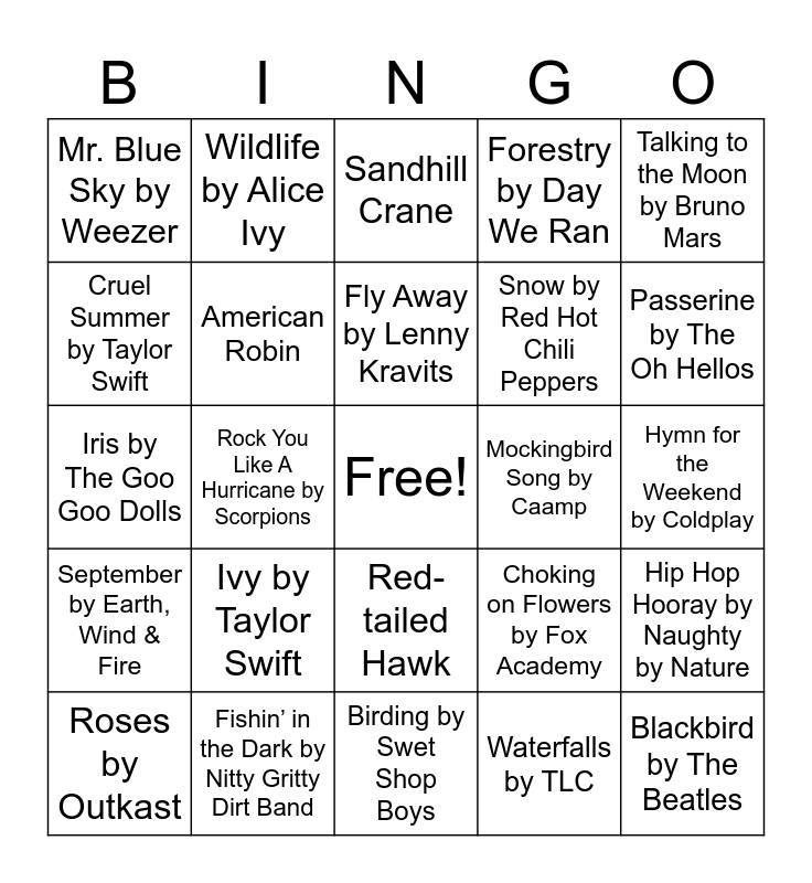 This bingo card has a free space and 75 words: Rattlesnake, Birds of a Feather by Billie Eilish, Sandhill Crane, The Bird Song by Noah Floersch, One Headlight by The Wallflowers, American Toad, Turn! Turn! Turn! by The Byrds, Three Little Birds by Bob Marley & The Wailers, Wild Thing by The Troggs, Rockin’ Robin by Bobby Day, Feather by Sabrina Carpenter, Stick Season by Noah Kahan, Fly Away by Lenny Kravits, Cruel Summer by Taylor Swift, Walking on Sunshine by Katrina & The Waves, Rock You Like A Hurricane by Scorpions, Mr. Jones by Counting Crows, Blackbird by The Beatles, Wildflowers by Tom Petty, Talking to the Moon by Bruno Mars, Daylight by Harry Styles, Iris by The Goo Goo Dolls, American Robin, Wildlife by Alice Ivy, Forestry by Day We Ran, Surfin’ Bird by The Trashmen, Edge of Seventeen by Stevie Nicks, Barracuda by Heart, Flowers by Miley Cyrus, Shake It Off by Taylor Swift, Heat Waves by Glass Animals, Beneath Oak Trees by Dylan Gossett, Wildflowers and Wild Horses by Lainey Wilson, Choking on Flowers by Fox Academy, Passerine by The Oh Hellos, Snow by Red Hot Chili Peppers, Red Fox, Crazy Bird by Wild Child, Hymn for the Weekend by Coldplay, Waterfalls by TLC, Take Me Home, Country Roads by John Denver, Where’d All the Time Go by Bird and Byron, Riptide by Vance Joy, Ain’t No Mountain High Enough by Marvin Gaye, Accidentally in Love by Counting Crows, Painted Sky by The National Parks, Roses by Outkast, Mr. Blue Sky by Weezer, Trees and Flowers by Strawberry Switchblade, The Fox by Ylvis, Red Dirt Road by Brooks & Dunn, Red-tailed Hawk, Hotel California by Eagles, The Lion Sleeps Tonight by The Tokens, Wildflowers by Trampled by Turtles, Free Bird by MOONLGHT, I Like Birds by Eels, Welcome to the Jungle by Guns N’ Roses, Pickin’ Wildflowers by Keith Anderson, Dancing in the Moonlight by King Harvest, Ivy by Taylor Swift, Fox Hunt by Sierra Ferrell, The Chicken in Black by Johnny Cash, Foxglove by Haley Heynderickx, Shrike by Hozier, Mockingbird Song by Caamp, Northern Cardinal, Lover by Taylor Swift, Take it Easy by Eagles, Hip Hop Hooray by Naughty by Nature, September by Earth, Wind & Fire, Fishin’ in the Dark by Nitty Gritty Dirt Band, Ragged Wood by Fleet Foxes, Birding by Swet Shop Boys and Squirrels by Mipso.