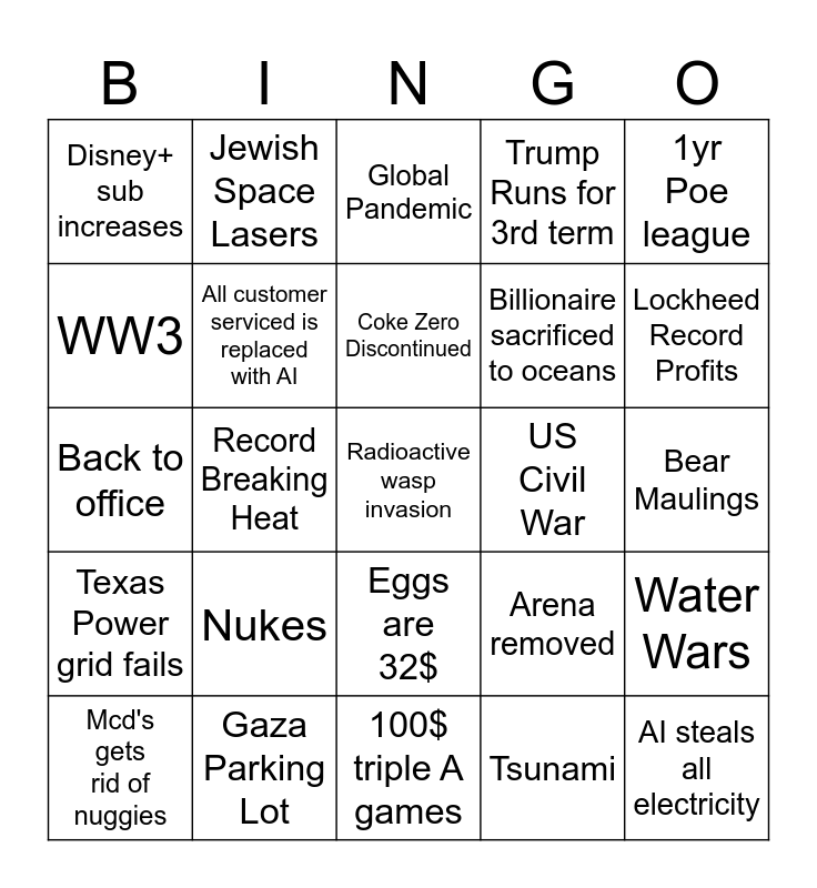 This bingo card has a free space and 24 words: Nukes, Gaza Parking Lot, Coke Zero Discontinued, Mcd's gets rid of nuggies, 1yr Poe league, Disney+ sub increases, WW3, Jewish Space Lasers, US Civil War, Eggs are 32$, Billionaire sacrificed to oceans, Back to office, Arena removed, Water Wars, All customer serviced is replaced with AI, Tsunami, Bear Maulings, Global Pandemic, Lockheed Record Profits, Record Breaking Heat, AI steals all electricity, Texas Power grid fails, Trump Runs for 3rd term and 100$ triple A games.